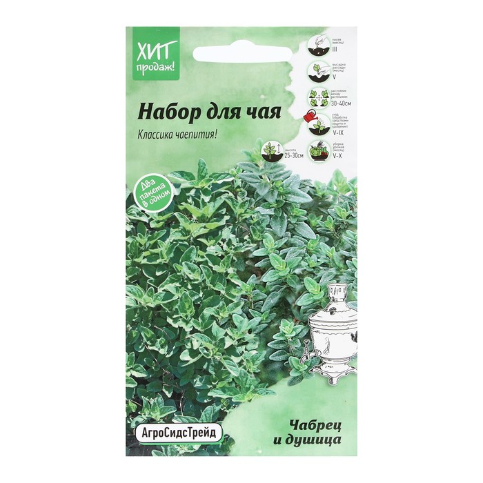 Набор семян пряных трав для приготовления ароматного чая – отличное приобретение для Вашего сада! В состав набора входят семена душицы Медовый аромат и тимьяна Медок (Чабреца). Это многолетние, травянистые растения, формируют полувертикальный, компактный кустик высотой 25-30 см. Прекрасные медоносы. Масса одного растения 150-200 г. Ароматичность сильная. Урожайность зеленой массы 3,2-3,5 кг/м2. Рекомендованы в домашней кулинарии, в консервировании и как лекарственное сырье. А также используют молодые побеги и листья в свежем и сушеном виде для приготовления чаев и освежающих ягодно-травяных напитков.