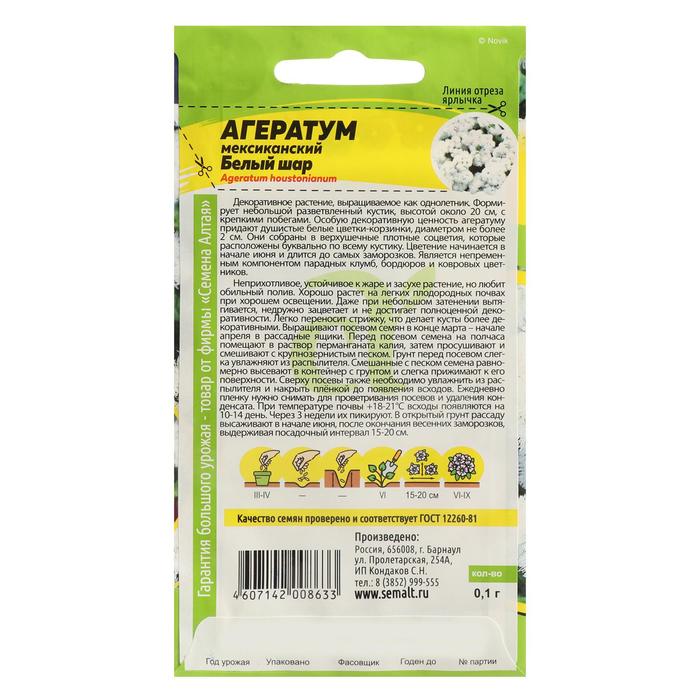 Декоративное растение, выращиваемое как однолетник. Формирует небольшой разветвленный кустик, высотой около 20 см, с крепкими побегами. Особую декоративную ценность агератуму придают душистые белые цветки-корзинки, диаметром не более 2 см. Они собраны в верхушечные плотные соцветия, которые расположены буквально по всему кустику. Цветение начинается в начале июня и длится до самых заморозков. Является непременным компонентом парадных клумб, бордюров и ковровых цветников. Неприхотливое, устойчивое к жаре и засухе растение, но любит обильный полив. Хорошо растет на легких плодородных почвах при хорошем освещении. Даже при небольшом затенении вытягивается, недружно зацветает и не достигает полноценной декоративности. Легко переносит стрижку, что делает кусты более декоративными. Выращивают посевом семян в конце марта – начале апреля в рассадные ящики. Перед посевом семена на полчаса помещают в раствор перманганата калия, затем просушивают и смешивают с крупнозернистым песком. Грунт перед посевом слегка увлажняют из распылителя. Смешанные с песком семена равномерно высевают в контейнер с грунтом и слегка прижимают к его поверхности. Сверху посевы также необходимо увлажнить из распылителя и накрыть плёнкой до появления всходов. Ежедневно пленку нужно снимать для проветривания посевов и удаления конденсата. При температуре почвы +18-21°С всходы появляются на 10-14 день. Через 3 недели их пикируют. В открытый грунт рассаду высаживают в начале июня, после окончания весенних заморозков, выдерживая посадочный интервал 15-20 см.