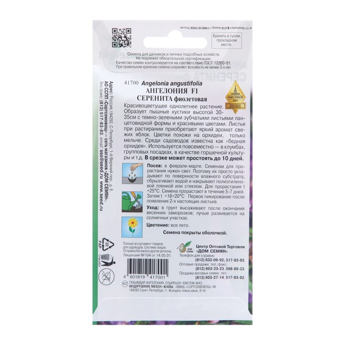 Ангелония –красивоцветущее однолетнее растение. Образует пышные кустики высотой 30-35см с темно-зелеными зубчатыми листьями ланцетовидной формы и красивыми цветами. Листья при растирании приобретают яркий аромат свежих яблок. Цветки похожи на орхидеи, только мельче. Среди садоводов известна как «бедная орхидея». Используется повсеместно — в клумбах, групповых посадках, в качестве горшечной культуры и т.д. В срезке может простоять до 10 дней.Посев: в феврале-марте. Cеменам для прорастания нужен свет. Поэтому их просто укладывают по поверхности влажного субстрата, сбрызгивают водой и накрывают полиэтиленовой пленкой или стеклом. Для прорастания t +25ºС. Семена прорастают в течение 5-7 дней. Затем t +18+20ºС Первое пикирование после появления 2-х настоящих листьев.