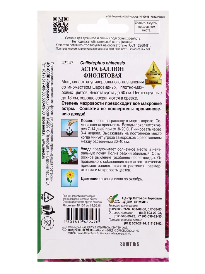 Семена цветов Астра Баллюн фиолетовая 30 шт