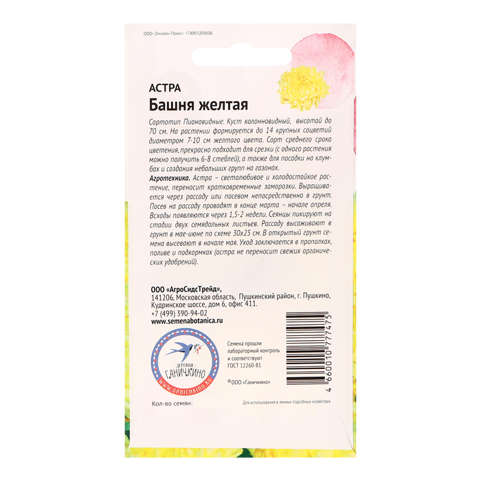 Сортотип Пионовидные. Куст колонновидный, высотой до70 см. На растении формируется до 14 крупных соцветий диаметром 7-10 см, желтого цвета. Сорт среднего срока цветения, прекрасно подходит для срезки (с одного рас- тения можно получить 6-8 стеблей), а также для посадки на клумбах и создания небольших групп на газонах. Агротехника. Астра — светолюбивое и холодостойкое рас- тение, переносит кратковременные заморозки. Выращива- ется через рассаду или посевом непосредственно в грунт. Посев на рассаду проводят в конце марта-начале апреля. Всходы появляются через 1,5-2 недели. Сеянцы пикируют на стадии двух семядольных листьев. Рассаду высаживают в грунт в мае-июне по схеме 30х25 см. В открытый грунт семена высевают в начале мая. Уход заключается в пропол- ках, поливе и подкормках (астра не переносит свежих орга- нических удобрений).