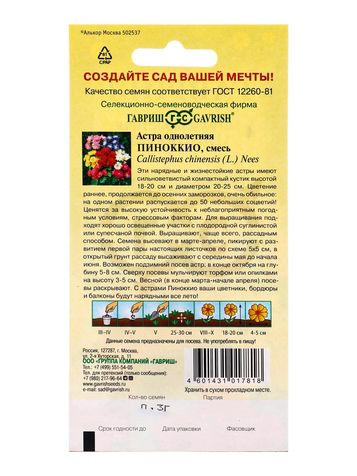 Семена цветов Астра Пиноккио, однолетняя (смесь) 0,3 г