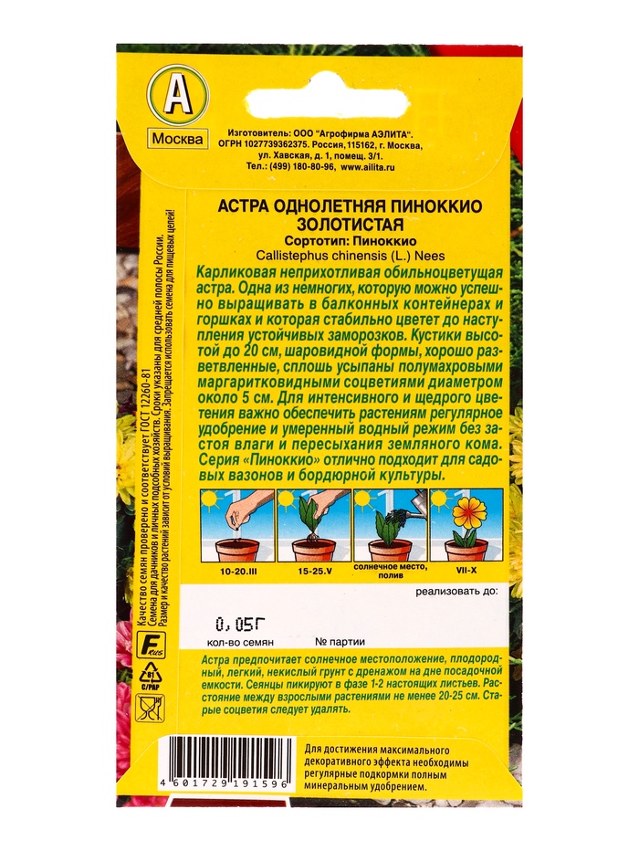 Семена цветов Астра Пиноккио золотистая Цветущий балкон, Ц/П,0,05 г