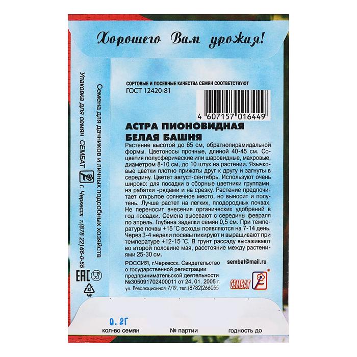 Однолетнее растение. Классическая пионовидная срезочная астра. Привлекательный обильно цветущий куст обратно пирамидальной формы с многочисленными соцветиями, высотой до 65 см. Цветоносы прочные, длиной 40-45 см. Соцветия махровые, полусферические или шаровидные, диаметром 8-10см. белого цвета, до 10 штук на растении. Язычковые цветки прижаты друг к другу и загнуты в середину. Цветёт август-октябрь. Отличаются великолепными срезочными свойствами, до двух недель стоят в воде, сохраняя декоративность. Прекрасно подойдут для оформления цветников и рабаток.