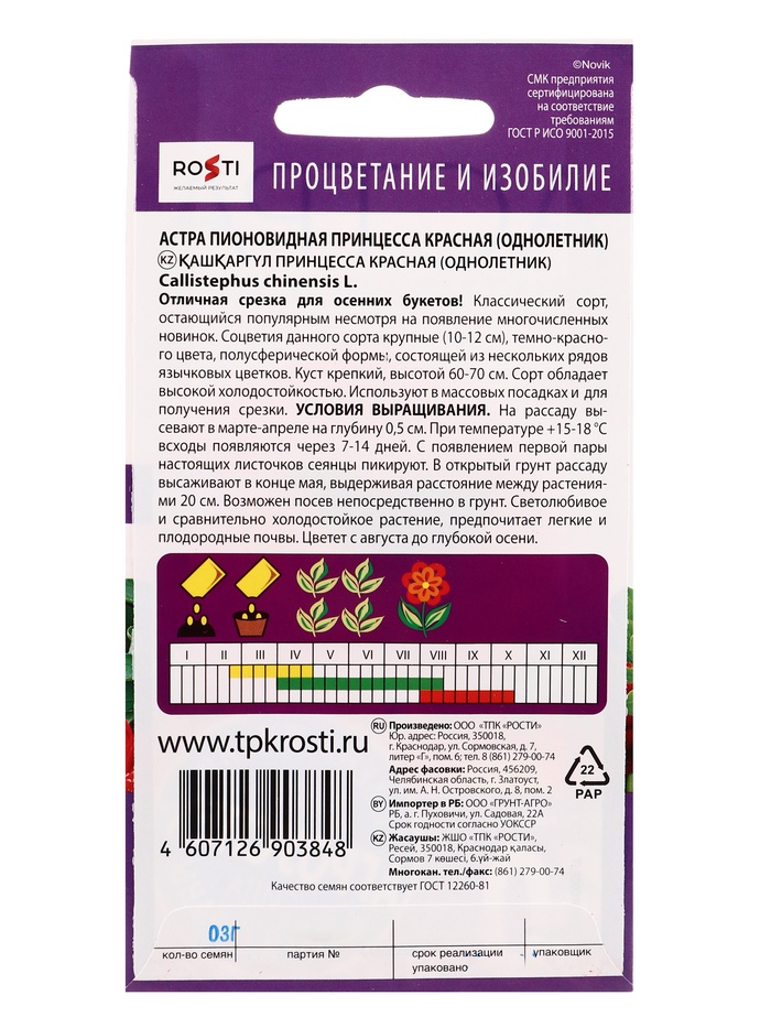 Семена высевают в марте-апреле, пикируют с развитием первой пары настоящих листочков по схеме 5х5 см. В открытый грунт рассаду высаживают с середины мая до начала июня. Возможен подзимний посев астр: в конце октября на глубину 5–8 см. Сверху посевы мульчируют торфом или опилками на высоту 3–5 см. Весной (в конце марта — начале апреля) посевы раскрывают.