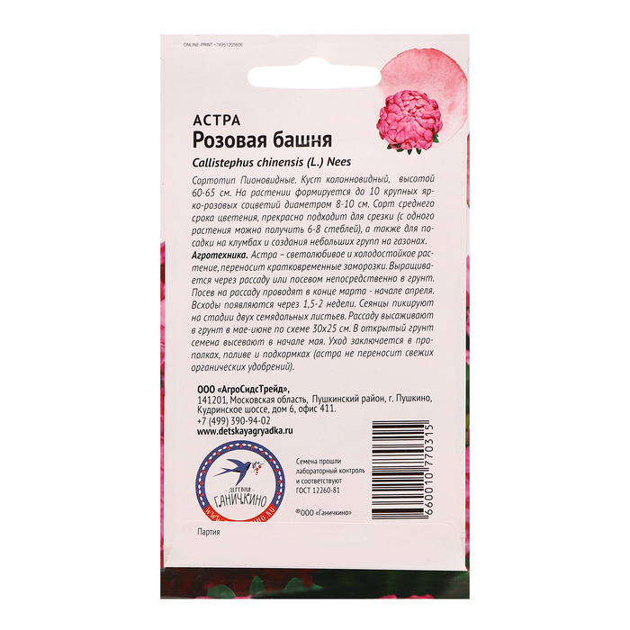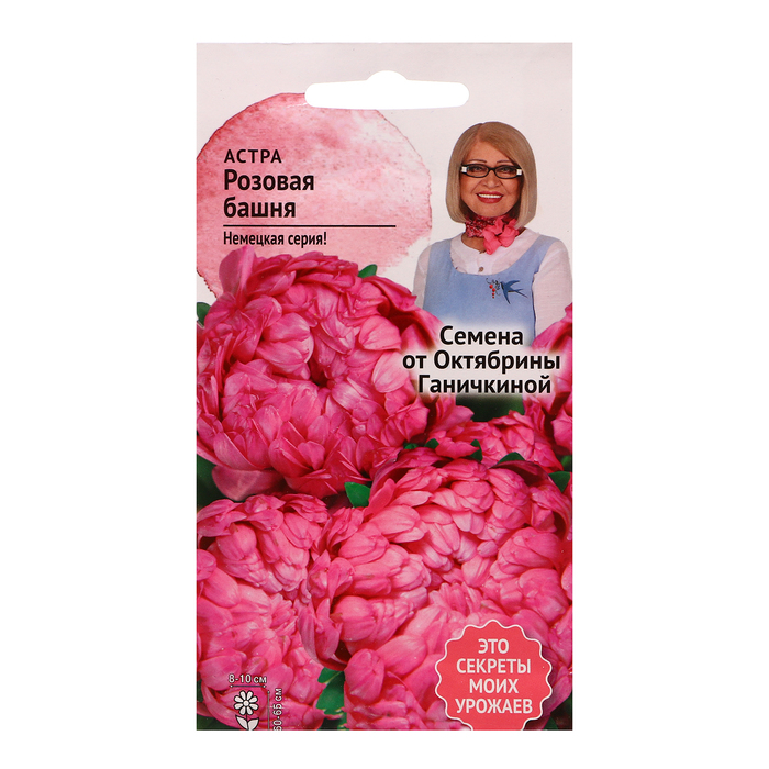 Сортотип Пионовидные. Куст колоновидный, высотой 60-65 см. На растении формируется до 10 крупных ярко-розовых соцветий диаметром 8-10 см. Сорт среднего срока цветения, прекрасно подходит для срезки (с одного растения можно получить 6-8 стеблей), а также для посадки на клумбах и создания небольших групп на газонах. Агротехника: Астра - светолюбивое и холодостойкое растение, переносит кратковременные заморозки. Выращивается через рассаду или посевом непосредственно в грунт. Посев на рассаду проводят в конце марта - начале апреля. Всходы появляются через 1,5-2 недели. Сеянцы пикируют на стадии двух семядольных листьев. Рассаду высаживают в грунт в мае-июне по схеме 30х25 см. В открытый грунт семена высевают в начале мая. Уход заключается в прополках, поливе и подкормках (астра не переносит свежих органических удобрений). Штрих-код - 4660010770315