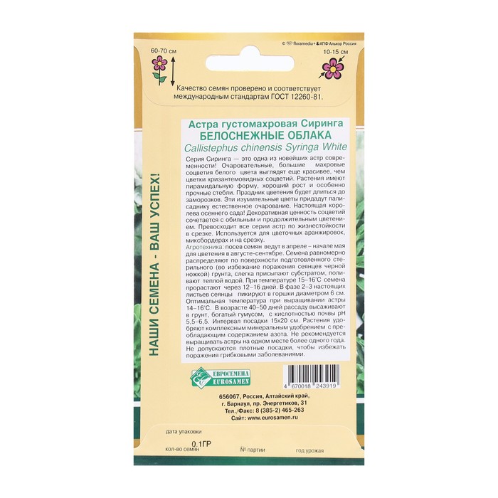 Серия Сиринга - это одна из новейших астр современности. Очаровательные, большие махровые соцветия белого цвета выглядят еще красивее, чем цветки хризантемовидных соцветий. Растения имеют пирамидальную форму, хороший рост и особенно прочные стебли. Праздник цветения будет длиться до заморозков. Эти изумительные цветы придадут палисаднику естественное очарование. Настоящая королева осеннего сада. Декоративная ценность соцветий сочетается с обильным и продолжительным цветением. Превосходит все серии астр по жизнестойкости в срезке. Используется для цветочных аранжировок, миксбордерах и на срезку.