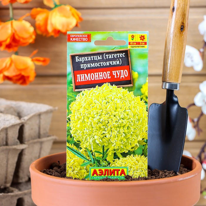 «Лимонное чудо» — это сорт невысоких компактных прямостоячих бархатцев, которые имеют оригинальные хризантемовидные корзинки диаметром 7–9 см. Отличается обильным ранним и продолжительным цветением с июня до окончания сезона.