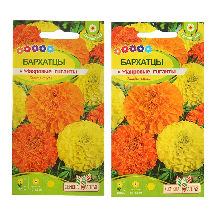Высокорослые бархатцы с крупными махровыми соцветиями будут украшать Ваш сад с июня до самых заморозков. Растение неприхотливо и отличается длительным цветением. Куст высотой до 100 см с явно выраженным главным побегом. Соцветия крупные (8-10 см в диаметре) густомахровые различной окраски: оранжевой, золотисто-желтой и лимонно-желтой. Листья перисто-рассеченные от светло- до тёмно-зелёных. Применяются для посадки в цветники, на клумбы, бордюры и на срезку. Растение светолюбиво, засухоустойчиво, нетребовательно к почве и влаге, но при избытке влаги крупные соцветия начинают загнивать.