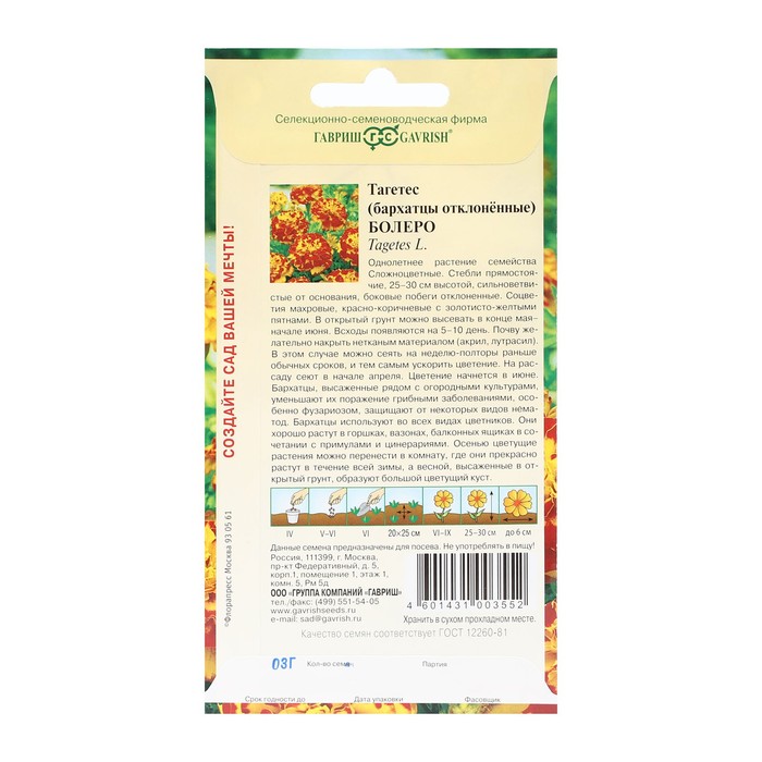 Однолетнее растение семейства Сложноцветные. Стебли прямостоячие, 25-30 см высотой, сильно ветвистые от основания, боковые побеги отклоненные. Соцветия махровые, красно-коричневые с золотисто-желтыми пятнами. В открытый грунт можно высевать в конце мая — начале июня. Всходы появляются на 5-10 день. Почву желательно накрыть нетканым материалом (акрил, лутрасил). В этом случае сеять можно на неделю-полторы раньше обычных сроков и тем самым ускорить цветение. На рассаду сеют в начале апреля. Цветение начнется в июне. Бархатцы, высаженные рядом с огородными культурами уменьшают их поражение грибными заболеваниями, особенно фузариозом, защищают от некоторых видов нематод. Бархатцы используют во всех видах цветников. Они хорошо растут в горшках, вазонах, балконных ящиках, в сочетании с примулами и цинерариями. Осенью цветущие растения можно перенести в комнату, где они прекрасно растут в течение всей зимы, а весной, высаженные в открытый грунт, образуют большой цветущий куст.