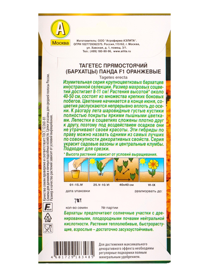 Семена цветов Бархатцы Панда F1 оранжевые прямостоячие Золотая серия, Ц/П,7 шт.