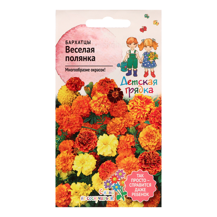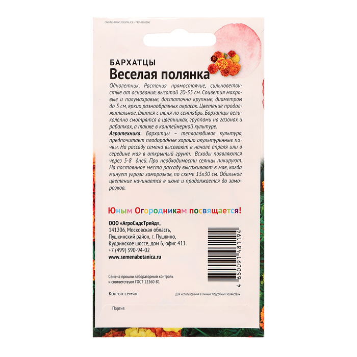 Однолетник. Растения прямостоячие, сильноветвистые от основания, высотой 20-35 см. Соцветия махровые и полумахровые, достаточно крупные, диаметром до 5 см, ярких разнообразных окрасок. Цветение продолжительное, длится с июня по сентябрь. Бархатцы великолепно смотрятся в цветниках, группами на газонах и рабатках, а также в контейнерной культуре. Агротехника: Бархатцы – теплолюбивая культура, предпочитает плодородные хорошо окультуренные почвы. На рассаду семена высевают в начале апреля или в середине мая в открытый грунт. Всходы появляются через 5-8 дней. При необходимости сеянцы пикируют. На постоянное место рассаду высаживают в мае, когда минует угроза заморозков, по схеме 15х30 см. Обильное цветение начинается в июне и продолжается до заморозков. Штрих-код - 4660010777505