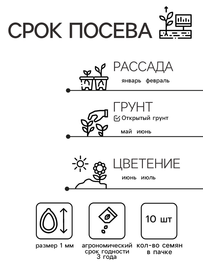 Посев: на рассаду в январе-феврале в плошки на уплотненную поверхность грунта. Посевы сбрызнуть теплой водой, закрыть полиэтиленовой пленкой или стеклом и прикрыть бумагой. Влажность почвы проверять не реже двух раз в день. Очень важно, чтобы верхний слой не пересыхал, но и не был слишком влажным. Всходы появляются через 10-14 дней при температуре 23 С и достаточной влажности. После появления всходов стекло или пленку снять. Сеянцы очень слабые, первое время растут медленно. Пикировка через 7 недель (1-ый раз на 2-3см, затем на 6-8 см). Для нормального развития растений требуется температура 18-20 С. В грунт высаживать, когда минует угроза заморозка.