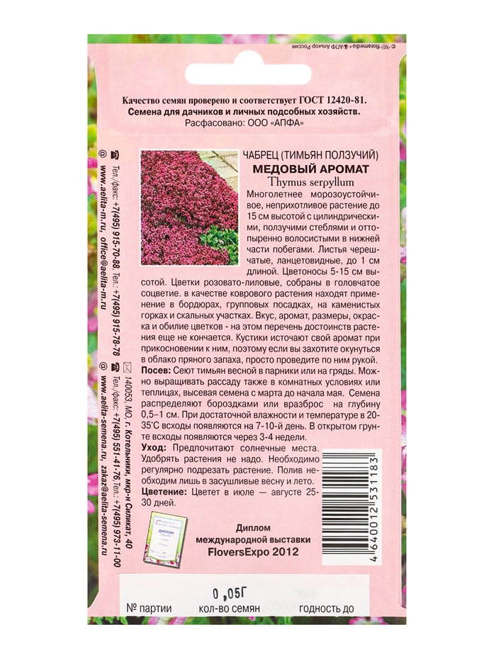 Ароматный многолетник. Неприхотливый, зимостойкий, засухоустойчивый. От всходов до начала использования 35-40 дней. Кустики стелющиеся, высотой 20-30 см, Ø 30-35 см, массой 35-50 г, хорошо облиственные. Урожайность – 0,3- 0,5 кг/м². Листья и молодые побеги используются в свежем и сушеном виде как пряность в кулинарии, для ароматизации чая и в медицине.Посев семян на рассаду в марте. Всходы появляются через 2 недели. С развитием одного-двух настоящих листочков сеянцы пикируют. Высаживают рассаду в открытый грунт, когда минует угроза заморозков. Возможен посев непосредственно в открытый грунт рано весной или под зиму. Требует нейтральных по кислотности почв легкого мехсостава и солнечной экспозиции. Не выносит переувлажнения.