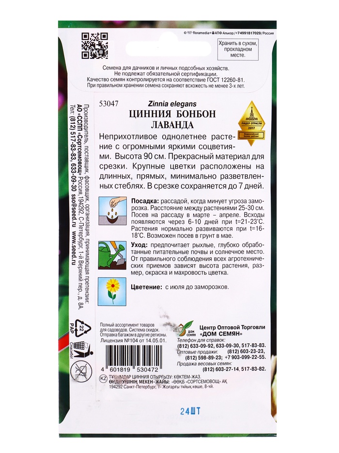 Семена цветов Цинния Бонбон лаванда 24 шт