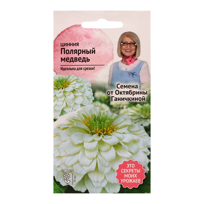 Однолетник. Растения высотой 80 см с крупными махровыми соцветиями диаметром до 10 см, окраска белая с зеленоватым оттенком. Циннию используют для посадки на сборные цветники, рабатки, клумбы и на срез для букетов. Агротехника: Растения светолюбивые, теплолюбивые и засухоустойчивые, не переносят заморозки. Семена высевают на рассаду в апреле или в открытый грунт в конце мая. Всходы появляются через 4 - 6 дней. В грунт рассаду высаживают в начале июня по схеме 20x30 см. Цветение наступает через 60-70 дней после появления всходов и продолжается до заморозков. Штрих-код - 4660010770513