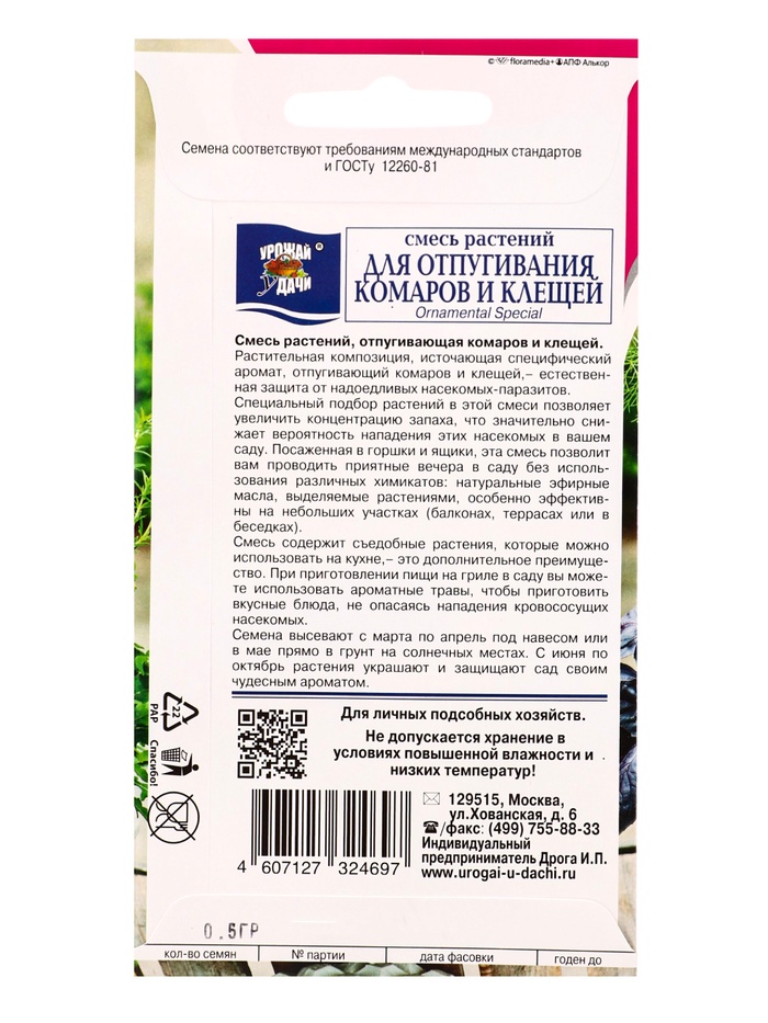 Семена цветов Смесь ДЛЯ ОТПУГИВАНИЯ КОМАРОВ И КЛЕЩЕЙ (новинка 0,5 г.