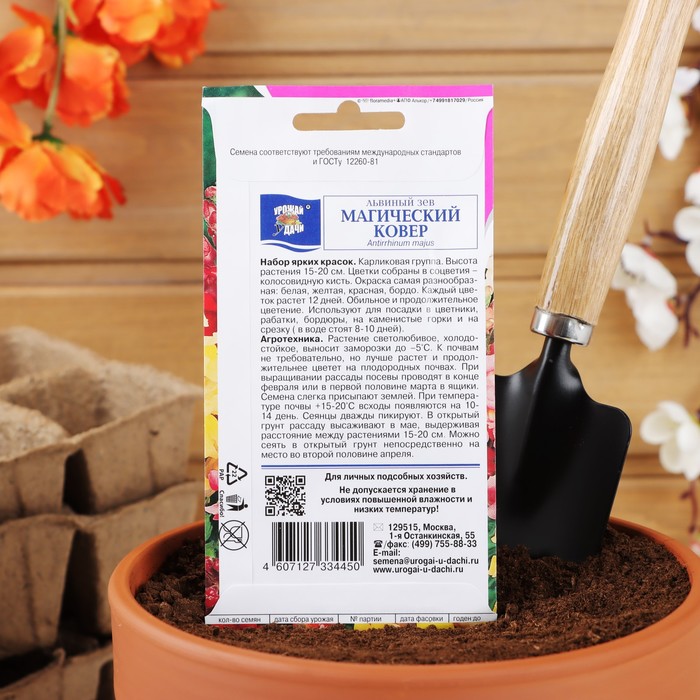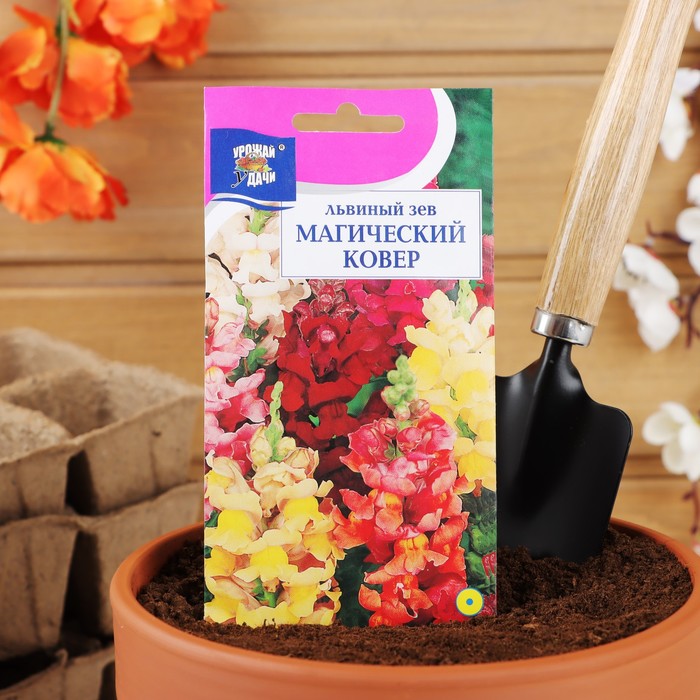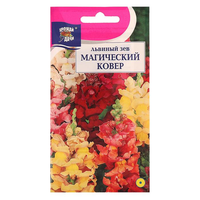 Львиный зев Магический ковер - набор ярких красок. Карликовая группа, высота растений до 20 см. Цветки собраны в соцветия-колосовидную кисть. Окраска самая разнообразная: белая, жёлтая, красная, бордо. Цветет с июня по октябрь. Обильное и продолжительное цветение. Используют для клумб рабаток, групповых и массовых посадок, миксбордеров и для срезки. Растение светолюбивое, холодоустойчивое, переносит заморозки до -5°C. К почвам нетребовательно.