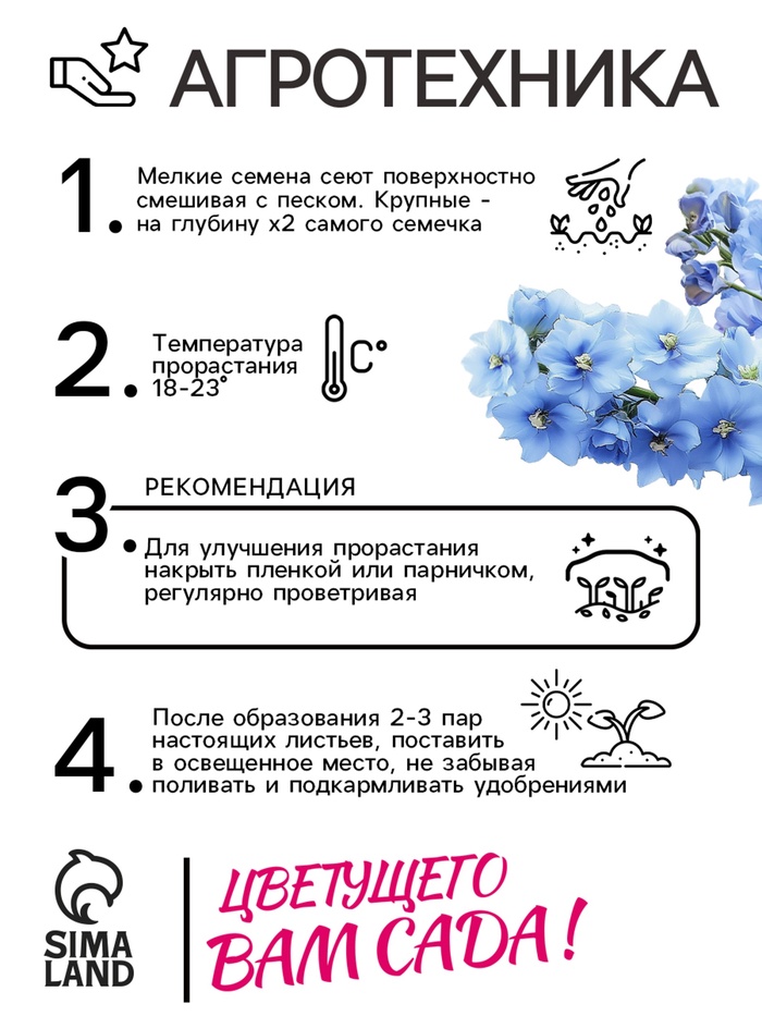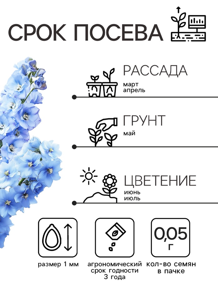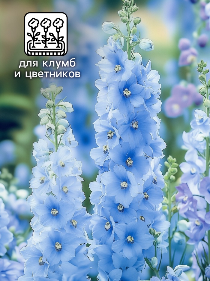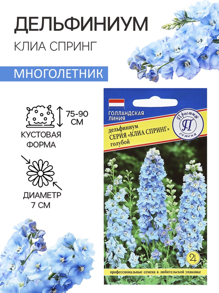 Многолетник. Серия «Клиа спринг» - компактная версия серии «Тихоокеанские великаны», высотой 75-90 см, диаметром 25-30 см. Крупные цветки до 7 см в диаметре с белым глазком собраны в мощные колосовидные соцветия. При посеве через рассаду зацветает в первый год. Дельфиниум используют для одиночных и групповых посадок, для рабаток. Прекрасно смотрится в срезке, цветы в воде сохраняются до 10 дней.