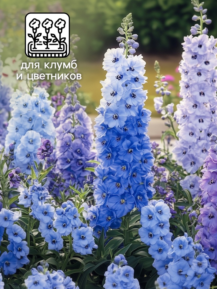 Специально подобранная смесь с крупными цветками всех оттенков синего. Плотные длинные колосовидные соцветия великолепны в срезке. Эффектное растение для размещения группами, в массивах, рабатках, миксбордерах, а одиночных посадках. При своевременном удалении отцветших побегов вторично зацветает в конце лета. На одном месте растет без пересадки 4-5 лет.