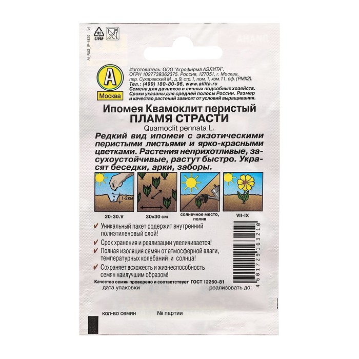Ипомея «Квамоклит» представляет собой необычную однолетнюю лиану с яркими цветами и ажурными листьями. Она быстро взбирается по любой опоре на высоту до 2,5 м и образует лёгкий занавес из воздушной зелени и многочисленных цветов-звёздочек. Не требует особого ухода. Будет достойным украшением террас, беседок и оград.