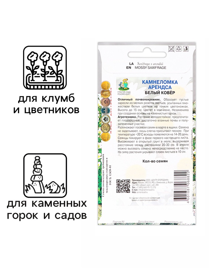Отличный почвопокровник. Образует густые заросли из мелких розеток листьев, усыпанных множеством белых цветков на тонких цветоножках. Высота до 20 см. Цветет в мае-июне. Незаменима при создании основы на каменистых горках.Агротехника. Растение холодостойкое, предпочитает плодородные, достаточно влажные почвы и полузатененные участки. Размножают посевом семян в марте в ящики. Семена не заделывают, лишь слегка присыпают песком. При температуре +20°C всходы появляются на 14-20 день. Сеянцы пикируют в фазе первого настоящего листа. Высаживают в открытый грунт в июле, выдерживая расстояние между растениями 20-30 см. В апреле можно высевать семена непосредственно на место. На зиму растения укрывают слоем листьев в 10 см.Семена соответствуют требованиям международных стандартов и ГОСТу РФ 12420-81