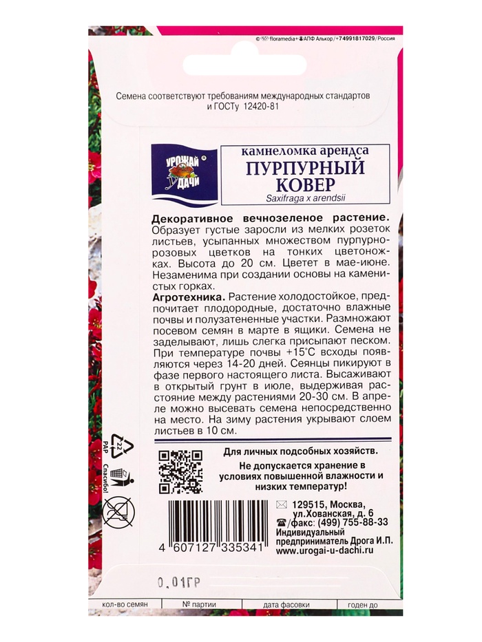 Семена цветов Камнеломка Пурпурный ковёр 0,01 г.