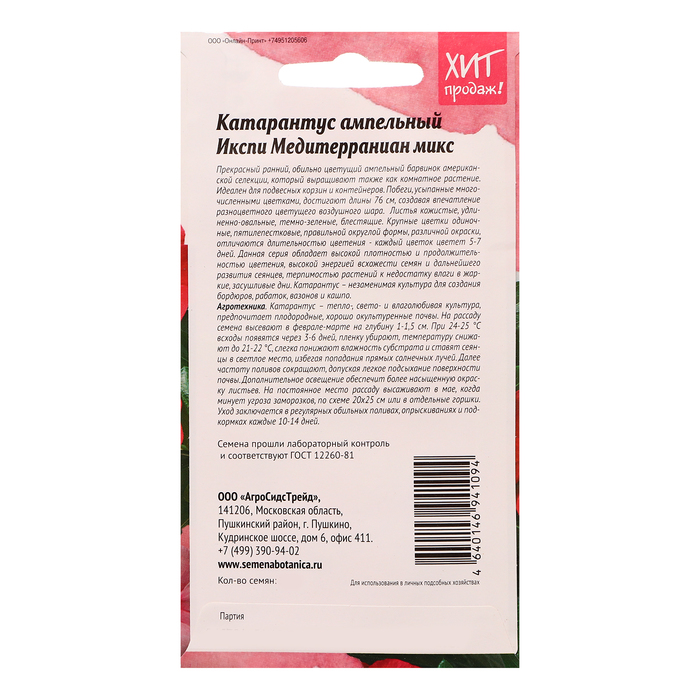 Прекрасный ранний обильноцветущий ампельный барвинок американской селекции, который выращивают также как комнатное растение. Идеален для подвесных корзин и контейнеров. Побеги, усыпанные многочисленными цветками, достигают длины 76см, создавая впечатление разноцветного цветущего воздушного шара. Листья кожистые, удлиненно-овальные, темно-зеленые, блестящие. Крупные цветки одиночные, пятилепестковые, правильной округлой формы, различной окраски, отличаются длительностью цветения - каждый цветок цветёт 5-7 дней. Данная серия обладает высокой плотностью и продолжительностью цветения, высокой энергией всхожести семян и дальнейшего развития сеянцев, терпимость растений к недостатку влаги в жаркие, засушливые дни. Катарантус – незаменимая культура для создания бордюров, рабаток, вазонов и кашпо. Агротехника: Катарантус – тепло-, свето- и влаголюбивая культура, предпочитает плодородные хорошо окультуренные почвы. На рассаду семена высевают в феврале-марте на глубину 1-1,5см. При 24-25°С всходы появятся через 3-6 дней, пленку убирают, температуру снижают до 21-22°С, слегка понижают влажность субстрата и ставят сеянцы в светлое место, избегая попадания прямых солнечных лучей. Далее частоту поливов сокращают, допуская легкое подсыхание поверхности почвы. Дополнительное освещение обеспечит более насыщенную окраску листьев. На постоянное место рассаду высаживают в мае, когда минует угроза заморозков, по схеме 20х25 см или в отдельные горшки. Уход заключается в регулярных обильных поливах опрыскиваниях и подкормках каждые 10-14 дней. Штрих-код -