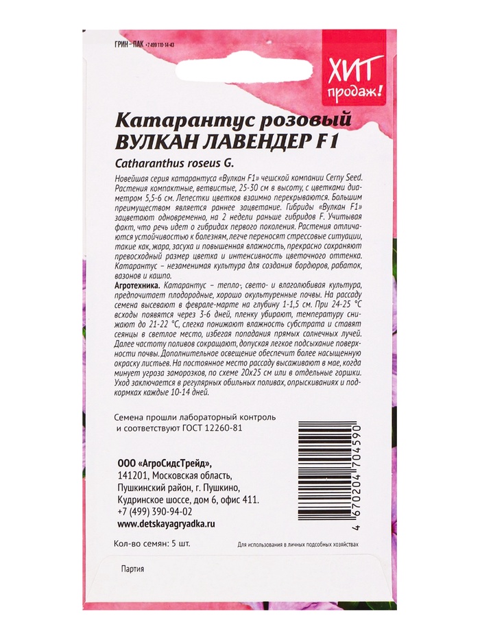 Новейшая сериякатарантуса«ВулканF1» чешской компании Cerny Seed. Растения компактные, ветвистые, 25–30 см в высоту, с цветками диаметром 5,5–6 см. Лепестки цветков взаимно перекрываются. Большим преимуществом является раннее зацветание. Гибриды «Вулкан 1» зацветают одновременно, на 2 недели раньше на две недели раньше гибридов. F Учитывая факт, что речь идет о гибридах первого поколения. Растения отличаются устойчивостью к болезням, легче переносят стрессовые ситуации, такие как, жару, засуху и повышенную влажность, прекрасно сохраняют превосходный размер цветка и интенсивность цветочного оттенка. Катарантус – незаменимая культура для создания бордюров, рабаток, вазонов и кашпо. Агротехника: Катарантус – тепло-, свето- и влаголюбивая культура, предпочитает плодородные хорошо окультуренные почвы. На рассаду семена высевают в феврале-марте на глубину 1-1,5см. При 24-25°С всходы появятся через 3-6 дней, пленку убирают, температуру снижают до 21-22°С, слегка понижают влажность субстрата и ставят сеянцы в светлое место, избегая попадания прямых солнечных лучей. Далее частоту поливов сокращают, допуская легкое подсыхание поверхности почвы. Дополнительное освещение обеспечит более насыщенную окраску листьев. На постоянное место рассаду высаживают в мае, когда минует угроза заморозков, по схеме 20х25 см или в отдельные горшки. Уход заключается в регулярных обильных поливах опрыскиваниях и подкормках каждые 10-14 дней. Штрих-код -