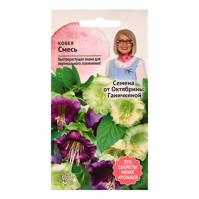 Многолетнее растение, выращиваемое как однолетнее. Вьющаяся лиана с перистыми морщинистыми листьями, достигающее в длину до 3 метров. Для достижения декоративного эффекта растение требует опоры. Смесь состоит из эффектных цветков с длинными тычинками, выходящими наружу, нежного белого и фиолетового колокольчатых цветов, 6-8см в диаметре. Кобея широко используется для вертикального озеленения, для декорации фасадов, веранд, беседок и шпалер. Агротехника: Кобея хорошо растёт и развивается на хорошо освещенном месте, это влаголюбивое растение, предпочитает легкие плодородные, хорошо увлажненные почвы. На рассаду семена высевают в феврале – начале марте при температуре не ниже 20°С, обязательно на свету. Всходы появляются через 2-3 недели. Пикировку проводят в фазе 1-2 настоящих листьев. На постоянное место рассаду высаживают в мае на расстоянии 50-70 см. Кобея положительно реагирует на подкормки и полив. Цветение с июля до заморозков. Штрих-код