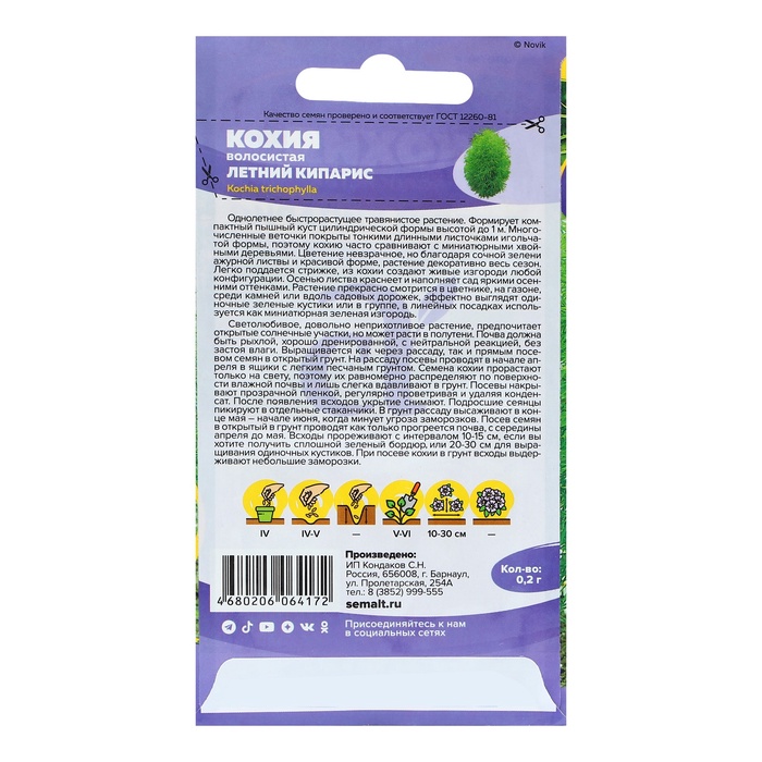 Однолетнее быстрорастущее травянистое растение. Формирует компактный пышный куст цилиндрической формы высотой до 1 м. Многочисленные веточки покрыты тонкими длинными листочками игольчатой формы, поэтому кохию часто сравнивают с миниатюрными хвойными деревьями. Цветение невзрачное, но благодаря сочной зелени ажурной листвы и красивой форме, растение декоративно весь сезон. Легко поддаётся стрижке, из кохии создают живые изгороди любой конфигурации. Осенью листва краснеет и наполняет сад яркими осенними оттенками. Растение прекрасно смотрится в цветнике, на газоне, среди камней или вдоль садовых дорожек, эффектно выглядят одиночные зеленые кустики или в группе, в линейных посадках используется как миниатюрная зелёная изгородь. Светолюбивое, довольно неприхотливое растение, предпочитает открытые солнечные участки, но может расти в полутени. Почва должна быть рыхлой, хорошо дренированной, с нейтральной реакцией, без застоя влаги. Выращивается как через рассаду, так и прямым посевом семян в открытый грунт. На рассаду посевы проводят в начале апреля в ящики с легким песчаным грунтом. Семена кохии прорастают только на свету, поэтому их равномерно распределяют по поверхности влажной почвы и лишь слегка вдавливают в грунт. Посевы накрывают прозрачной пленкой, регулярно проветривая и удаляя конденсат. После появления всходов укрытие снимают. Подросшие сеянцы пикируют в отдельные стаканчики. В грунт рассаду высаживают в конце мая – начале июня, когда минует угроза заморозков. Посев семян в открытый в грунт проводят как только прогреется почва, с середины апреля до мая. Всходы прореживают с интервалом 10-15 см, если вы хотите получить сплошной зеленый бордюр или 20-30 см для выращивания одиночных кустиков. При посеве кохии в грунт всходы выдерживают небольшие заморозки.