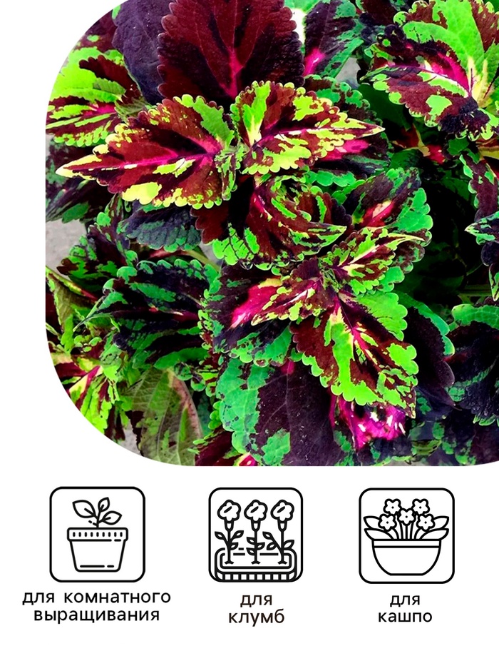 Однолетник. Карликовый гибрид колеуса (15 см) с превосходным побегообразованием. Цветёт очень поздно, благодаря чему долго сохраняет свою декоративность. Идеально подходит для горшечной культуры, бордюрных посадок и клумб.