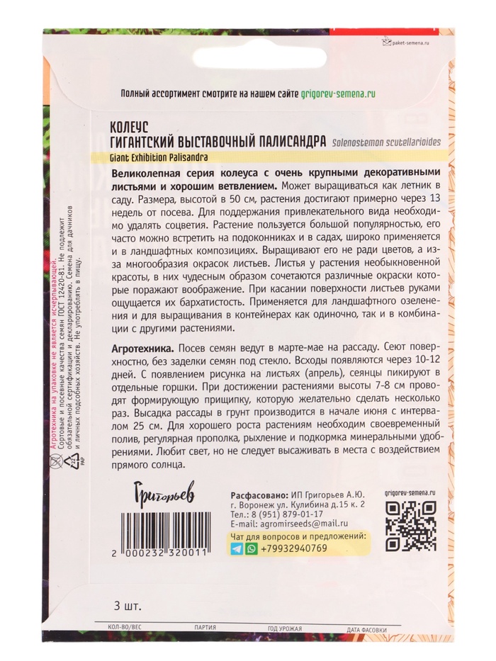 Семена цветов Колеус Гигантский Выставочный Палисандра (Giant Exhibition Palisandra) 3 шт. 12.29 г.