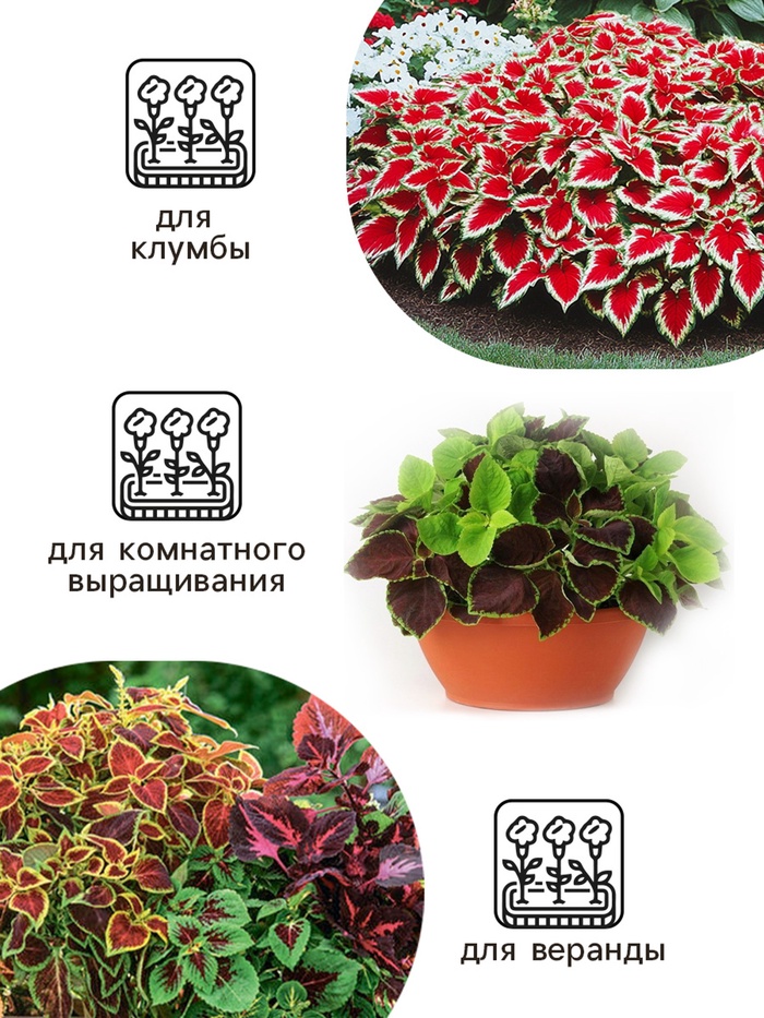 Однолетник. Высокорослый гибрид колеуса с большими, декоративными цветными листьями. Рекомендуется для групповых посадок или как фон для более низких цветов.