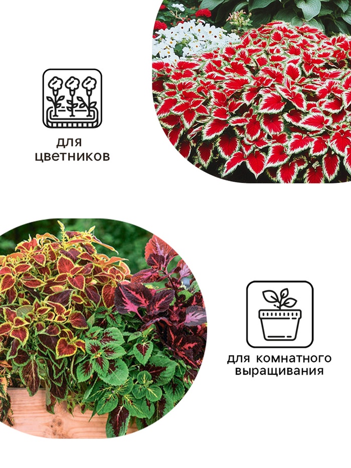 Однолетник. Компактные растения с красивой листвой. Высота растения достигает 25-30 см. Отлично развивается и как комнатное растение. Достойно вписывается в любой растительный ансамбль. Колеус известен и популярен не своими цветками, а своими листьями. Листья у Колеуса Визарт довольно крупные и очень яркие по цвету - красно-зеленые. Величина некоторых из них может превышать 15 сантиметров. Листья не выгорают на солнце, их насыщенный цвет сохраняется на протяжении всего сезона. Колеус хорошо смотрится в контейнерных композициях с другими летниками, в группах, на клумбах, в бордюрах, на рабатках. Посев семян на рассаду в марте. Сеют поверхностно, без заделки, под стекло. Всходы появляются через 10-12 дней. С появлением рисунка на листьях сеянцы пикируют в отдельные горшки. При достижении растениями высоты 7-8 см проводят формирующую прищипку. Высадка рассады в грунт – в начале июня. Чтобы растение не тратило сил на цветение, удаляют цветочные стрелки сразу после их появления.