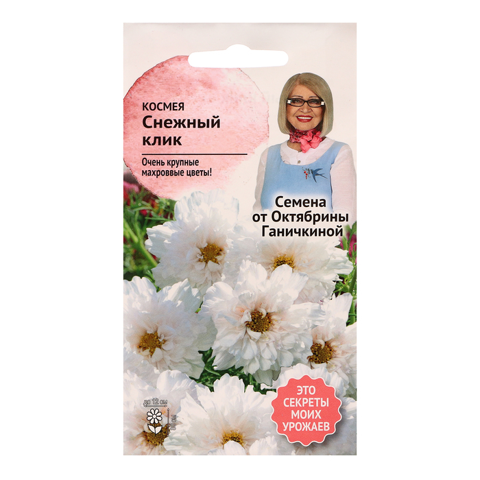 Однолетнее растение, высотой больше 80 см. Формирует мощный, сильноветвистый куст украшенный множеством соцветий. Соцветия очень крупные, махровые, снежно-белые, диаметром до 12 см. Цветение обильное и продолжительное. Смесь великолепно подходит для срезки и групповых посадок на цветниках и рабатках. Агротехника: Космея - неприхотливая культура, произрастает на любых типах почв, предпочитает солнечное местоположение. Посев производят в начале мая непосредственно в открытый грунт. Всходы появляются на 8-14 день. Цветет обильно с середины июня по сентябрь. Прекрасно размножается самосевом. Штрих-код - 4660010770414
