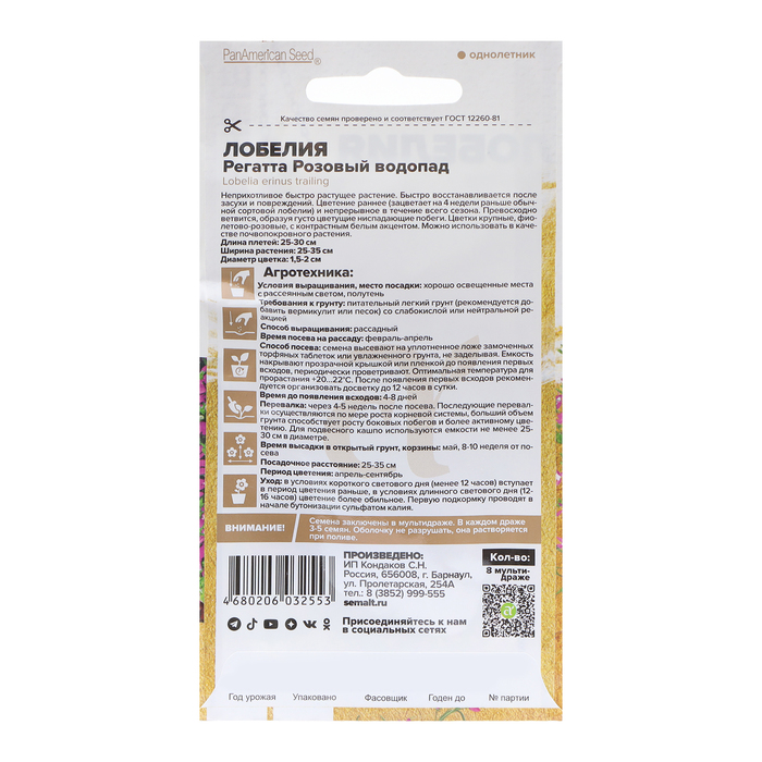 Лобелии серии Regatta являются эталоном среди ампельных лобелий. Они сочетают в себе экстра-раннее начало цветения, широкий выбор расцветок, продолжительное и обильное цветение. Растение сначала формирует сильно-ветвистый кустик, высотой 15-20см, и затем, продолжающие свой рост побеги, начинают ниспадать каскадами ярких цветов, достигая длины до 35см. В период цветения все растение покрыто одиночными, до 2см в диаметре, темно-розовыми с белым центром цветками. Отлично подойдет для выращивания в подвесных кашпо и балконных ящиках, вазонах и больших контейнерах, по периметру приподнятых клумб.