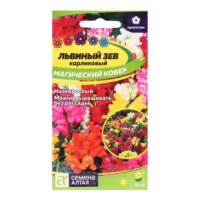 Очень популярный садовый однолетник высотой до 30 см. Искусно подобранная оригинальная смесь карликовых сортов львиного зева различной окраски: белой, ярко-желтой, красной, розовой, пурпурной. Послужит украшением любого цветника. Прекрасно смотрится на переднем плане клумб и рабаток. В массовых посадках образует густой яркий цветочный ковер. Цветёт с конца июня по октябрь. Для увеличения продолжительности цветения увядшие цветки рекомендуется удалять. Холодостойкое, засухоустойчивое растение. Хорошо растёт на открытых солнечных участках, выносит небольшое затенение. Предпочитает богатые, хорошо удобренные, слегка увлажнённые почвы, но не выносит переувлажнения. Выращивают как рассадным способом, так и прямым посевом семян в грунт. Посевы на рассаду проводят с начала марта. Для этого контейнер с дренажными отверстиями наполняют грунтом, оставив 2-3 сантиметра до краев, слегка уплотняют поверхность грунта и хорошо увлажняют. С помощью линейки делают канавки глубиной 0,2-0,3 см с интервалом 1,0 см. Производят посев семян рядками и присыпают небольшим слоем песка или грунта (0,1-0,2 см). Посевы опрыскивают из пульверизатора, накрывают пленкой и помещают в теплое (+20-23°С) светлое место. Пленку периодически снимают для проветривания посевов и удаления конденсата. Всходы появляются через 10-14 дней, пленку убирают и контейнер переносят в более прохладное (+18-20°C) светлое место. При необходимости проводят досветку фитолампами. Растениям необходимо около 16 часов света в сутки. С появлением первой пары настоящих листочков сеянцы пикируют. В фазе 4-5 листочков верхушки молодых побегов прищипывают для увеличения кустистости. В открытый грунт рассаду высаживают в конце мая – начале июня, посадочный интервал – 20 см. В районах с мягким климатом возможен посев семян в открытый грунт в середине апреля.