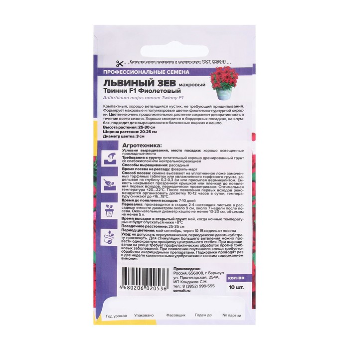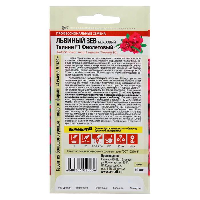 Новая серия низкорослого махрового львиного зева с оригинальным строением цветков. Растения формируют компактные, хорошо ветвящиеся кустики высотой до 30 см, покрытые очаровательными полумахровыми имахровыми малиново-вишневыми цветками. Волны обильного цветения продолжаются весь сезон, до первых заморозков. Рекомендуется выращивать в горшках диаметром 10-12 см,контейнерах и кашпо. При посадке на клумбах и бордюрах создает ощущение яркого ковра.Холодостойкое, засухоустойчивое растение. Хорошо растёт на солнечных участках, выносит небольшое затенение. Предпочитает плодородные почвы, не выносит переувлажнения. Выращивают рассадным способом или прямым посевом в грунт. Посевы на рассаду проводят с начала марта: слегка уплотняют грунт и хорошо увлажняют, делают канавки глубиной 0,2-0,3 см с интервалом 1,0 см, семена присыпают небольшим слоем песка или грунта (0,1-0,2 см). Для получения наилучшего результата посев рекомендуем проводить в торфяные таблетки (одно драже в таблетку). Посевы опрыскивают, накрывают пленкой и помещают в теплое (+20-23°С) светлое место. Пленку периодически снимают для проветривания и удаления конденсата. После появления всходов пленку снимают и контейнер переносят в более прохладное (+18-20°C) место. При необходимости проводят досветку фитолампами. Растениям необходимо около 16 часов света в сутки. С появлением первой пары настоящих листочков сеянцы пикируют. В фазе 4-5 листочков верхушки молодых побегов прищипывают для увеличения кустистости. В открытый грунт рассаду высаживают в конце мая – начале июня, посадочный интервал – 20 см. В районах с мягким климатом возможен посев семян в открытый грунт в середине апреля. Внимание! Семена дражированные - оболочку драже не разрушать!