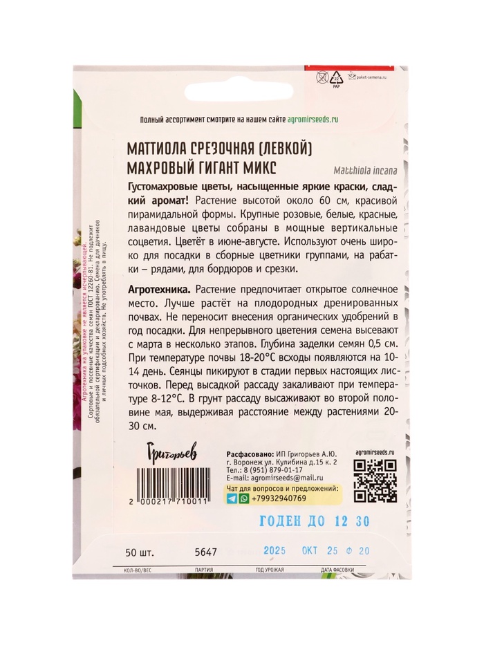 Семена цветов Маттиола Махровый Гигант Микс срезочная 50шт. 12.29 г.