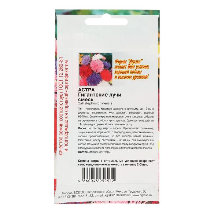 Смесь универсальных астр для цветников и букетов. Растения высокорослые, до 70 см, с широкими, хорошо разветвленными кустами. Цветут в средние сроки, со второй декады августа до устойчивых заморозков. Соцветия махровые, изящные, крупные – Ø11-13 см. Срезанные соцветия сохраняют свежесть в воде до 14 дней. Растения холодостойкие, светолюбивые, не выносят застоя воды в почве.