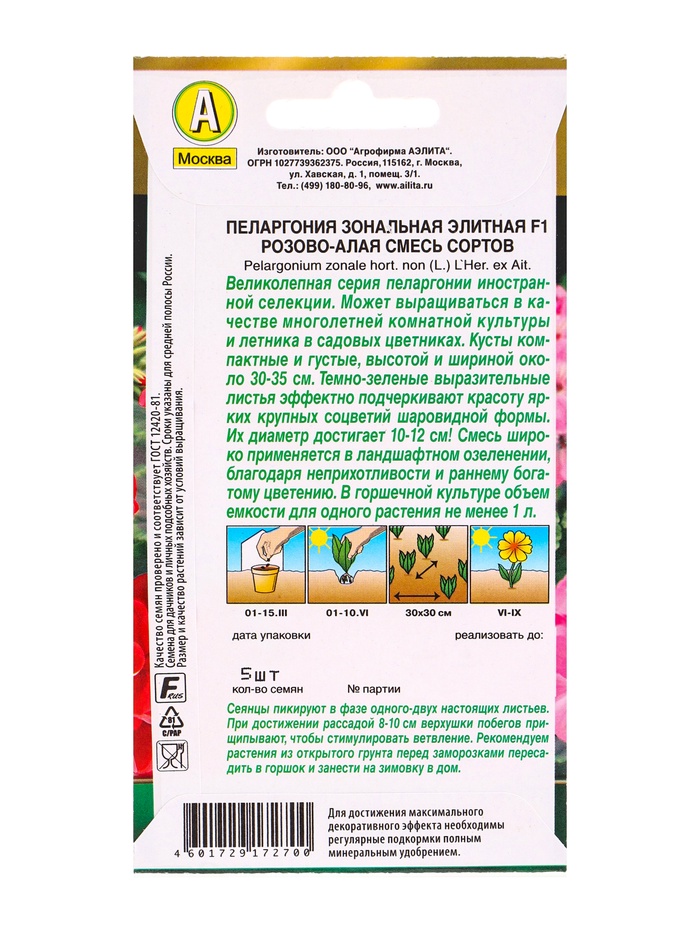 Семена цветов Пеларгония Элитная F1 розово-алая, смесь сортов Мн Золотая серия, Ц/П,5 шт.