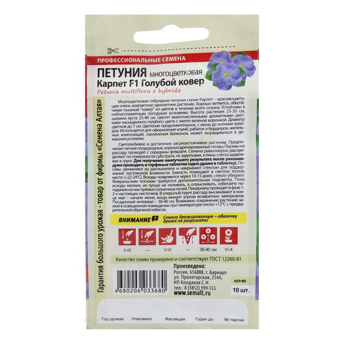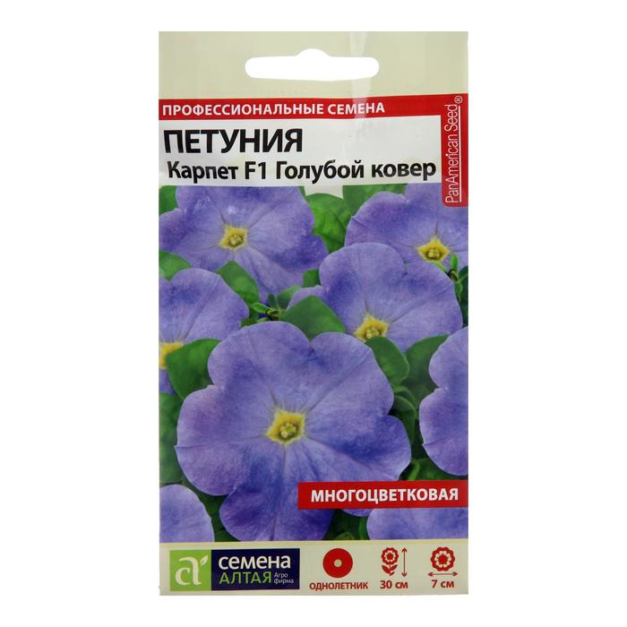 Многоцветковая гибридная петуния серии Карпет – красивоцветущее очень компактное однолетнее растение. Хорошо ветвится, обеспечивая пышный "ковер" из цветов в течение всего сезона. Устойчиво к неблагоприятным погодным условиям. Высота растения 25-30 см, ширина куста 25-40 см. Цветет многочисленными ароматными цветками насыщенного голубого цвета с желто-зеленой воронкой. Диаметр цветков до 7 см. Используется для оформления клумб, рабаток и бордюров, ампельных композиций, озеленения балконов, может выращиваться в домашних условиях. Светолюбивое и достаточно засухоустойчивое растение. Предпочитает легкие плодородные, хорошо дренированные почвы. Посевы на рассаду проводят с середины февраля. Семена равномерно распределяют по поверхности субстрата, не заделывая, а лишь слегка вдавливая в грунт. Для получения наилучшего результата посев рекомендуем проводить в торфяные таблетки (одно драже в таблетку). Посевы увлажняют из распылителя и накрывают стеклом для поддержания постоянной влажности. Емкость помещают в светлое теплое место (+22-24°С). Всходы появляются через 10-15 дней, стекло убирают. Февральским посевам требуется дополнительная подсветка. Пока всходы мелкие, их лучше не поливать, а опрыскивать, избегайте попадания на них прямых солнечных лучей. Пикировку проводят в фазе 1-2-х настоящих листочков. В открытый грунт рассаду высаживают в конце мая - начале июня, когда минует угроза возвратных заморозков. Посадочный интервал – 30-40 см. Обильное и продолжительное цветение с июня до осенних заморозков. Возможно сохранение растений зимой в освещенном помещении при температуре около +12°С с предварительной обрезкой побегов. Внимание! Семена дражированные - оболочку драже не разрушать!