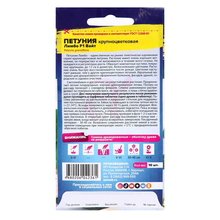 Петуния Лимбо – единственная на рынке генетически карликовая серия крупноцветковой петунии. Растение имеет очень хорошее ветвление, не перерастает и не вытягивается в течение всего сезона. Не нуждается в регуляторах роста. Образует компактные кустики, покрытые крупными, до 12 см в диаметре, белоснежными цветками. Растение очень быстро восстанавливается после дождя. Цветение наступает раньше, чем у других крупноцветковых петуний. Идеальный материал для декоративного оформления балконов, фасадов зданий, городских и садовых участков. Светолюбивое и достаточно засухоустойчивое растение. Предпочитает легкие плодородные, хорошо дренированные почвы. Посевы на рассаду проводят с середины февраля. Семена равномерно распределяют по поверхности субстрата, не заделывая, а лишь слегка вдавливая в грунт. Для получения наилучшего результата посев рекомендуем проводить в торфяные таблетки (одно драже в таблетку). Посевы увлажняют из распылителя и накрывают стеклом для поддержания постоянной влажности. Емкость помещают в светлое теплое место (+22-24°С). Всходы появляются через 10-15 дней, стекло убирают. Февральским посевам требуется дополнительная подсветка. Пока всходы мелкие, их лучше не поливать, а опрыскивать, избегайте попадания на них прямых солнечных лучей. Пикировку проводят в фазе 1-2-х настоящих листочков. В открытый грунт рассаду высаживают в конце мая - начале июня, когда минует угроза возвратных заморозков. Посадочный интервал – 30-40 см. Обильное и продолжительное цветение с июня до осенних заморозков. Возможно сохранение растений зимой в освещенном помещении при температуре около +12°С с предварительной обрезкой побегов. Внимание! Семена дражированные - оболочку драже не разрушать!