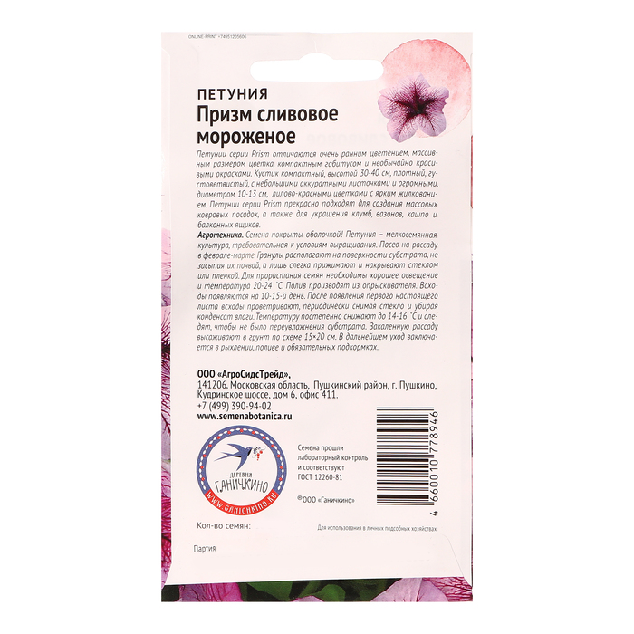 Растение компактное, высотой 35 см. Цветки очень крупные, диаметром 12 см, густомахровые, эффектной окраски – пурпурной с белой каймой. Цветение продолжительное, обильное. Гибрид устойчив к неблагоприятным условиям произрастания. Используется для оформления клумб, вазонов, кашпо и балконных ящиков. Агротехника: Семена покрыты оболочкой! Петуния – мелкосемянная культура, требовательная к условиям выращивания. Посев на рассаду в феврале-марте. Гранулы располагают на поверхности субстрата, не засыпая их почвой, а лишь слегка прижимают и накрывают стеклом или пленкой. Для прорастания семян необходимо хорошее освещение и температура 20-24˚С. Полив производят из опрыскивателя. Всходы появляются на 10-15 день. После появления первого настоящего листа всходы проветривают, периодически снимая стекло и убирая конденсат влаги. Температуру постепенно снижают до 14-16˚С и следят, чтобы не было переувлажнения субстрата. Закаленную рассаду высаживают в грунт по схеме 15×20 см. В дальнейшем уход заключается в рыхлении, поливе и подкормах.