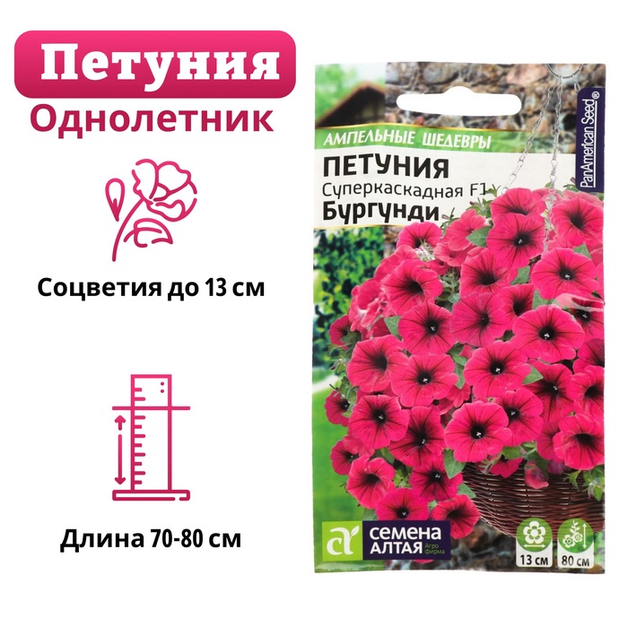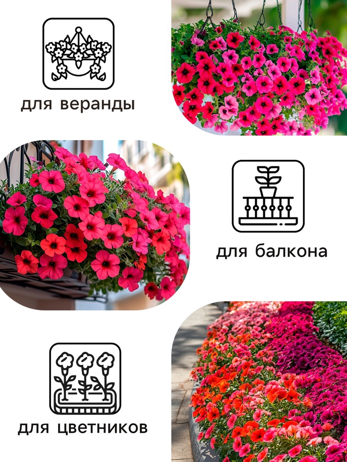 Великолепно смотрится в подвесных корзинах, балконных ящиках и высоких садовых вазах. Гибкие и длинные побеги, достигающие в длину 40 см, украшены шлейфом крупных (до 13 см диаметром) цветков, которые раскрываются один за другим без перерыва с июня по сентябрь. Цветение пышное и продолжительное. Растение отличает быстрый и стабильный рост в различных условиях выращивания.