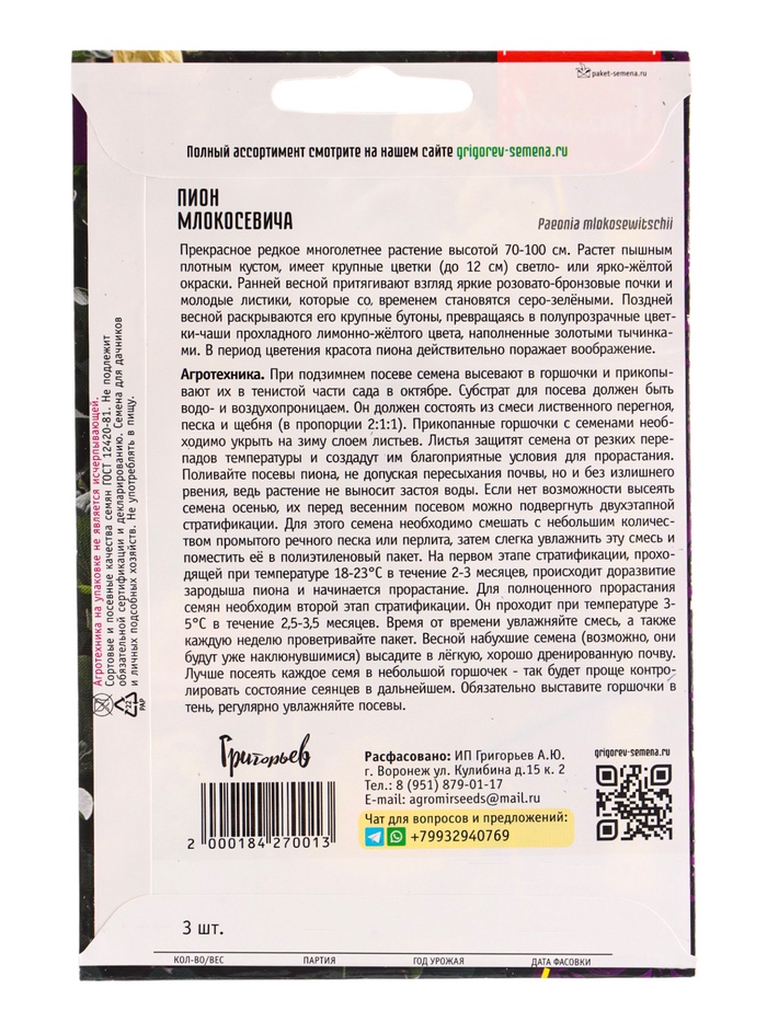 Семена цветов Пион Млокосевича 3шт. 12.29 г.