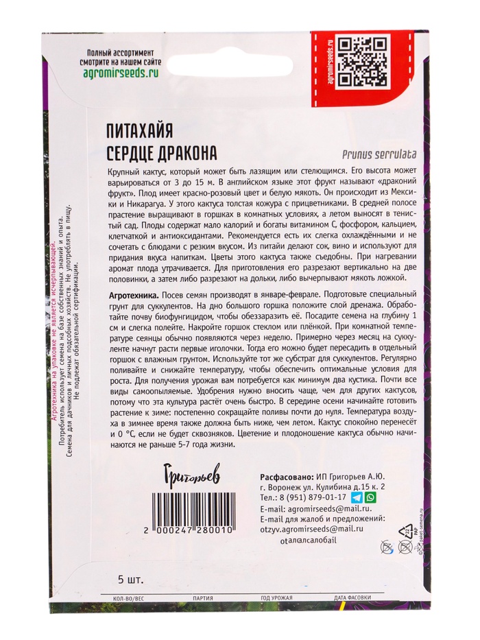 Семена цветов Питахайя Сердце Дракона 5шт. АКЦИЯ 12.28 г.
