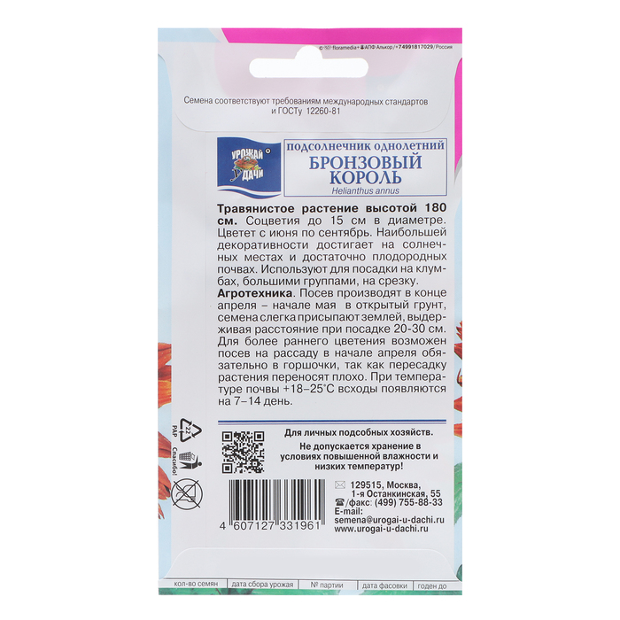 Семена цветов Подсолнечник «Бронзовый Король», 0.4 г, «Урожай Удачи»