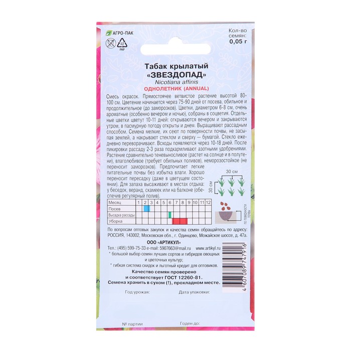Смесь окрасок. Прямостоячее ветвистое растение высотой 80-100 см. Цветение начинается через 75-90 дней от посева, обильное и продолжительное (до заморозков). Цветки, диаметром 6-8 см, очень ароматные (особенно вечером и ночью), собраны в соцветия. Отдельные цветки цветут 10-11 дней: открываются вечером и закрываются утром, в пасмурную погоду открыты и днём. Выращивают рассадным способом. Семена мелкие, их сеют по поверхности почвы, не засыпая землёй, а накрывают стеклом и сверху – бумагой. Стекло ежедневно переворачивают. Всходы появляются через 10-18 дней. После пикировки рассаду 2-3 раза подкармливают азотными удобрениями. Растение сравнительно теневыносливое (растёт на солнце и в полутени), влаголюбивое (требует обильных поливов), неморозостойкое (не переносит заморозков). Предпочитает лёгкие питательные почвы без избытка влаги. После высадки в грунт дают подкормки комплексным удобрением с промежутком 10-14 дней (до начала цветения). Хорошо переносит пересадку (даже в цветущем состоянии). Для запаха высаживают в местах отдыха: у беседок, веранд, скамеек или на балконе (обеспечив регулярный полив).